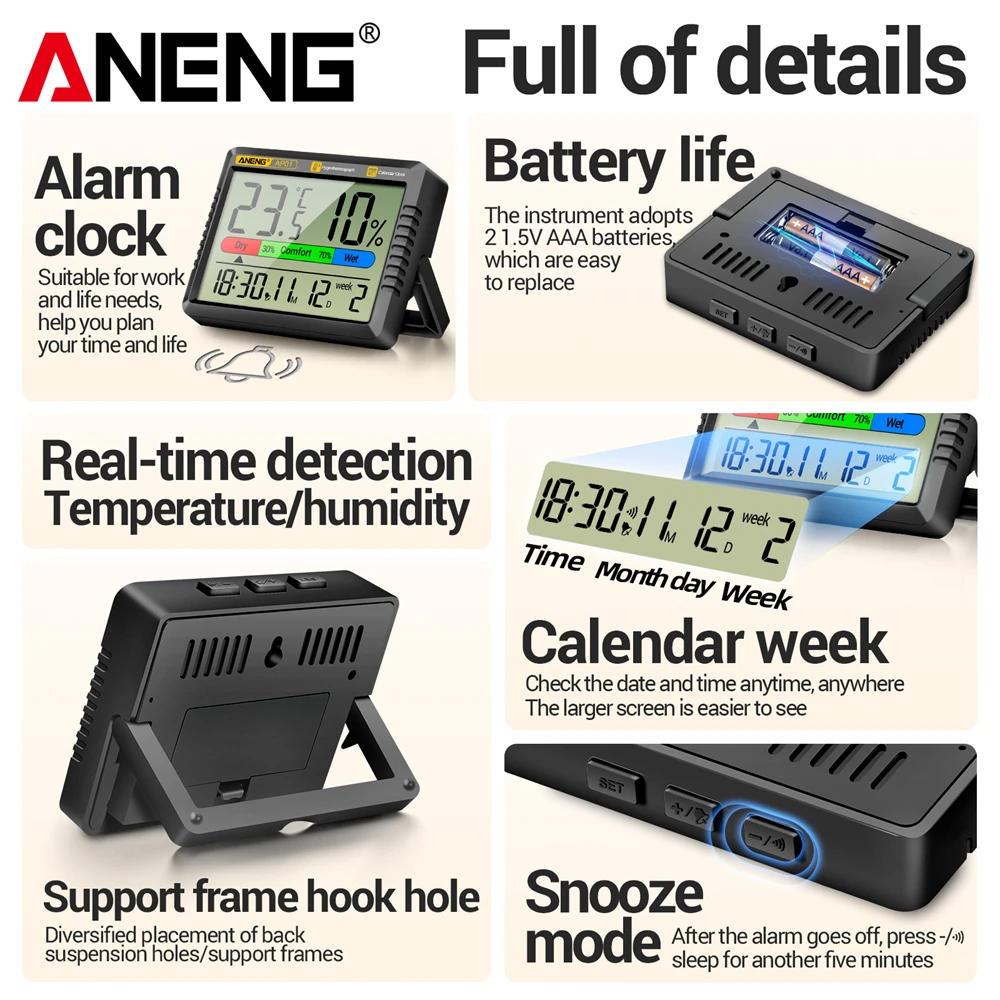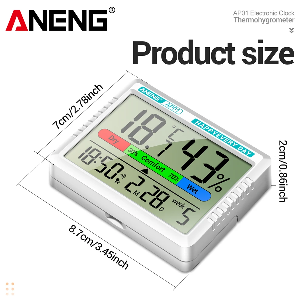 ANENG AP01 LCD Digital Thermometer Hygrometer Indoor Room Temperature Humidity Meter Alarm Clock Weather Station For Home
