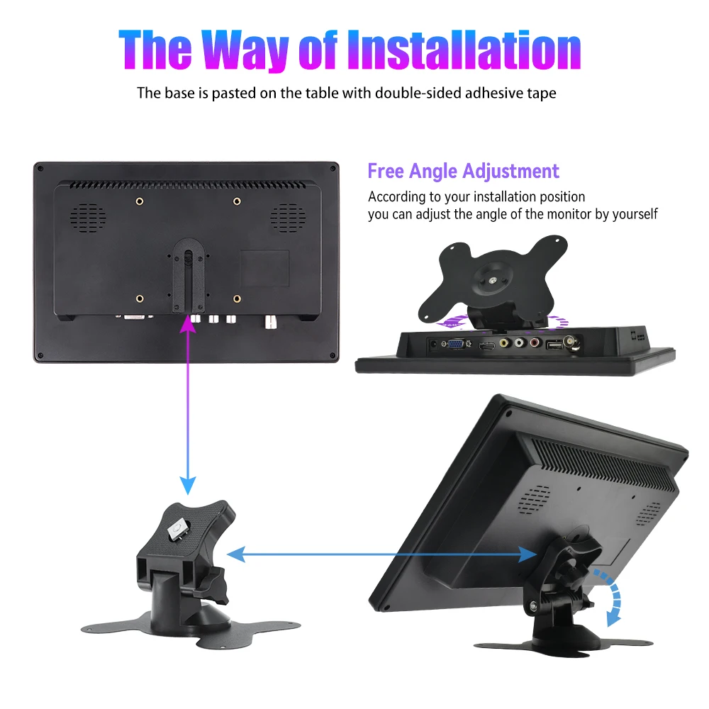 Easy to mount and pack: The stand is perfect allowing you to adjust the viewing angle and rotate the screen to meet all your needs. Portable to carry so that you can enjoy your favorite shows at home, on car or during travel. There are four holes on the back of the monitor, so that you can hang it on the wall as a TV. (screws not included).